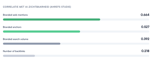 Uit een recente Ahrefs-studie blijkt dat brand mentions een 3x sterkere correlatie hebben met AI-zichtbaarheid (0.664) dan het aantal backlinks (0.218). AI-modellen zoals ChatGPT en Perplexity gebruiken branded web mentions om te bepalen welke merken relevant zijn voor specifieke prompts.
